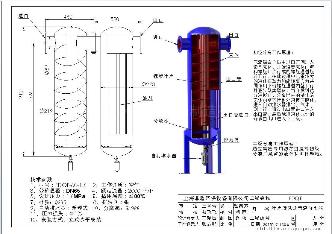 使用范围:本产品是挡板式分离器用于分离蒸汽、压缩空气及其它气体系统中内含的液滴,配上绝热套可提高分离器的工作性能。。